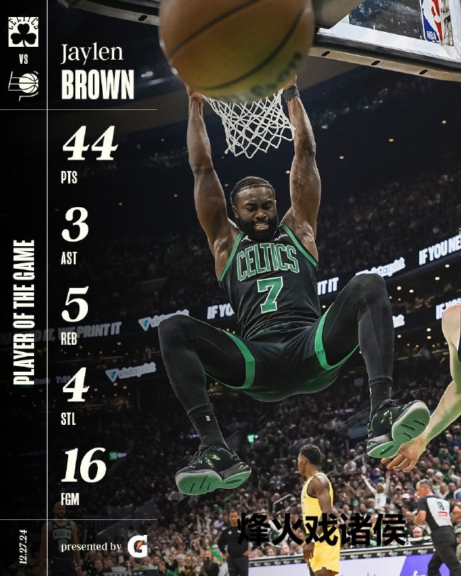 杰伦-布朗24投16中,开云体育官网三分球11中6狂轰44分率队获取一场37分的大捷,凯尔特东谈主斥逐连败稳居东部第二。